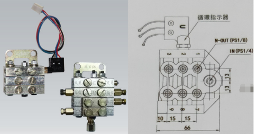 在遞進式油路分配器片組中,設有循環指示桿,分配器每一次工作循環,循環指示桿動作一次,當指示桿伸出接觸到循環指示器中的微動開關,微動開關動作,以監測潤滑系統是否出現失壓、斷流或者超負荷的狀況。