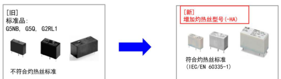 歐姆龍繼電器G5NB/G5Q/G2RL系列為此推出灼熱絲-HA型號(hào),兩者的區(qū)別就在于外殼和基座的塑料材質(zhì)是否為阻燃材料。