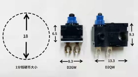 一分錢的硬幣直徑18mm,邊厚1.25mm,而D2GW開關外形尺寸W8.3mm×D5.3mm×H6.5mm,可以說是目前市面上體積非常小的開關了。