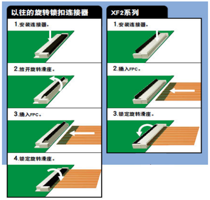 一、 旋轉式滑座從FPC插入口獨立出來。這樣一來,提起FPC時,滑座并不會斷開。這就保證了即使受到過度的外力,安裝好的FPC也不會脫開。