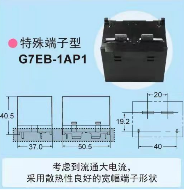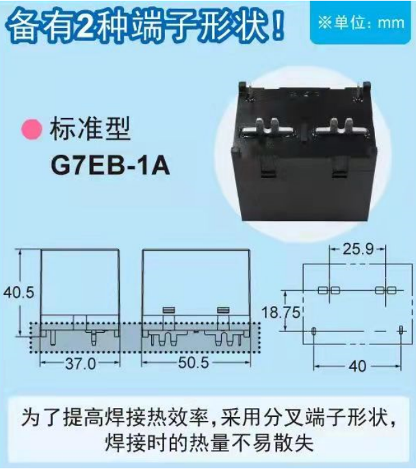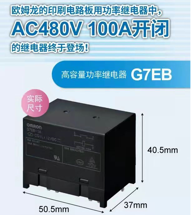 歐姆龍繼電器G7EB系列聚大容量與高功率兼具的功率繼電器,實現AC480V 100A開閉,而實際尺寸僅50.5mm(長)*37(寬)*40.5(高),并備有2種端子形狀。