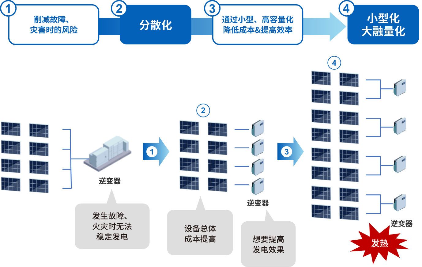 近年來,太陽能發電系統上的需求不斷發生變化。作為地震或水災等災害風險對策,更加穩定的電力供給需求愈發高漲,并出現了從集中型系統向分散型系統轉化的趨勢。并非通過1臺光伏逆變器執行電力轉換,而是分散至多臺光伏逆變器,由此降低了發生災害時因設備故障等所致發電停止的風險。此外,各設備或機器上通過高容量、大電流化的配置提高了發電效率,并通過小型化、輕量化削減了設備投資,因而要求有效利用設備的呼聲愈發高漲。而另一方面,伴隨小型化、高容量化的發展,當務之急是減少設備本身產生的熱量,這是造成能量損失和降低設備使用壽命的一個因素。