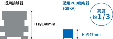 為了解決這個發熱課題而開發的產品便是G9KA型高容量功率繼電器。G9KA在行業內實現低接觸電阻0.2mΩ,有效抑制了作為小型化、高容量化重大課題的發熱。此外,與同等電流容量的接觸器相比,高度采用只有其1/3左右的緊湊型尺寸,有助于實現設備的小型化、省空間化。