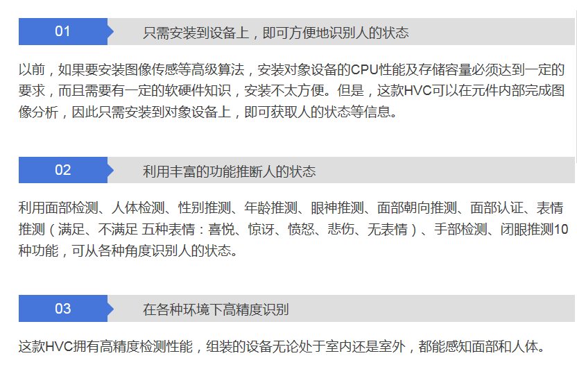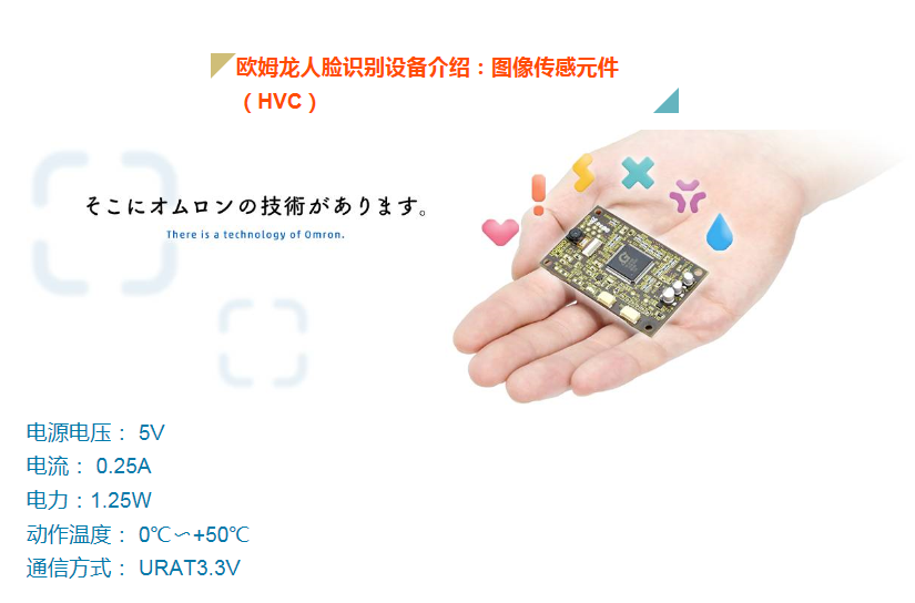 在人臉識別設備裝載型圖像傳感元件“HVC(Human Vision Components)”中,集成了面部認證、表情推測、手部檢測等可以識別個人狀態的圖像傳感技術“OKAO Vision”,其中包括10種算法和相機模塊。只需裝載到現有的設備中,即可在原有功能的基礎之上,添加智能識別人臉的功能。