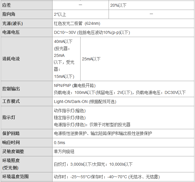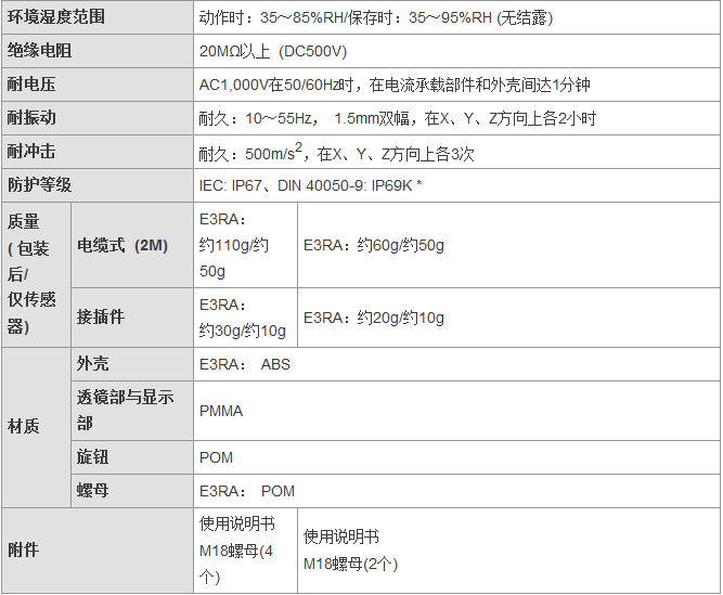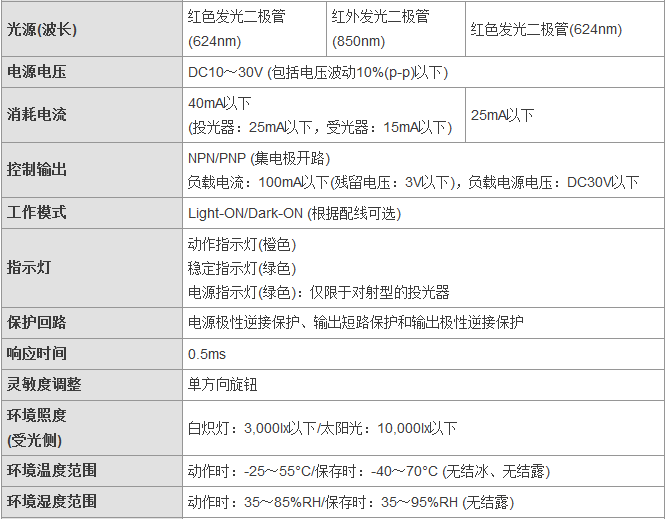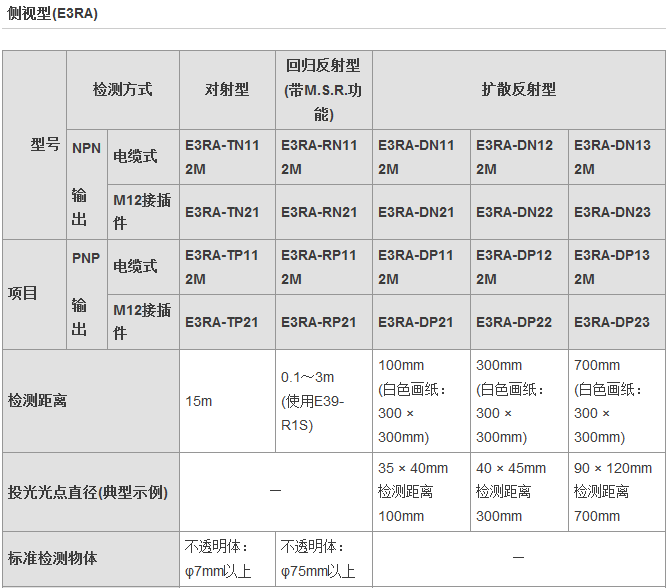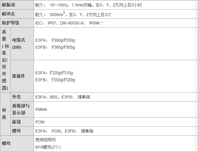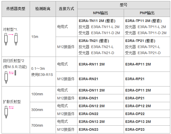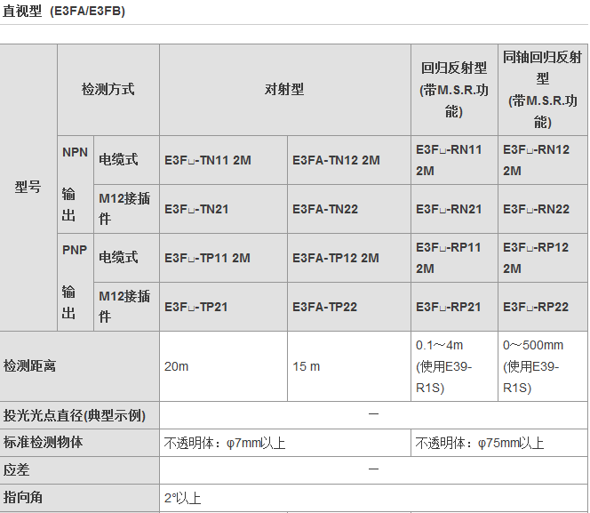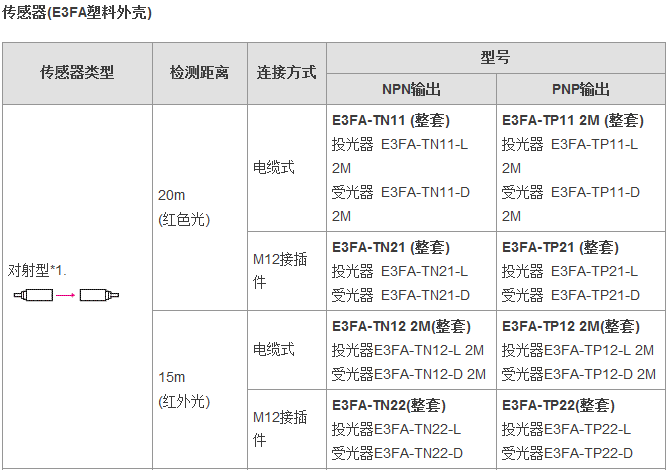 從食品飲料、紡織、制陶制磚到物流,E3FA/E3RA/E3FB型傳感器通常安裝于各行各業(yè)的廠房之中,無(wú)論是何種應(yīng)用總有一款適合您。這一應(yīng)用廣泛的光電傳感器系列具有高可靠性和增強(qiáng)的性能,其中包含對(duì)射型、回歸反射型和擴(kuò)散反射型(具有直視型和側(cè)視型兩種版本)。對(duì)于某些特定應(yīng)用,背景抑制型、限定反射型和透明體檢測(cè)型也提供了直視型版本。